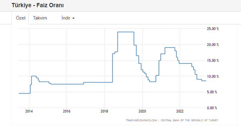 Halbuki 2018 yılında çeşitli siyasal etkilerle yapay olarak hızlı yükselen kurlara müdahale amacıyla %24 seviyesine yükseltilmiş bir faiz oranımız vardı, aşağıdaki grafikte son 10 yılın değişimlerini görebilirsiniz. Ancak tüketimi ve üretimi artırarak büyümeye devam etmek, Türk Lirasının değerini düşük tutarak ihracatta patlama yapmak gibi alt gerekçelerle ama temelde “faiz sebep, enflasyon sonuçtur” teorisini ispatlamak amacıyla 2019 yılında TCMB gösterge faizini indirmeye başladı. Kısa bir süre sonra yeniden kadro değişikliği oldu ve faiz yukarı yönlü hareketlendi ama bu da uzun sürmedi ve 2021 yılından itibaren istikrarlı şekilde düşük faiz politikasına geçildi.